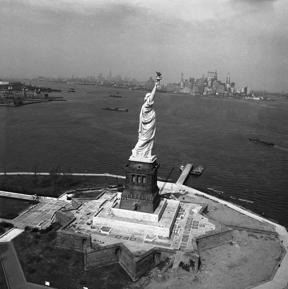10. Леса вокруг статуи Свободы, построенные для проведения работ по гидроизоляции ее подножия, 1930 год. Дождевая вода годами просачивалась через щели в постаменте и вредила конструкции.