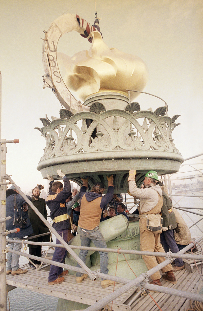 44. Пламя факела, снятое со статуи Свободы 16 декабря 1984 года, устанавливают на новое основание для отправки в Калифорнию, где часть скульптуры станет декорацией на Матче розовой чаши в Пасадене. На факел статуи Свободы установили новое «пламя».