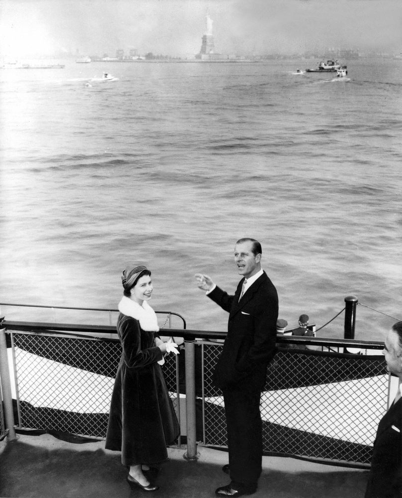 23. Королева Елизавета и принц Филипп на борту военного катера, везущего королевскую чету из Статен-Айленда к Манхэттену во время однодневного визита в Нью-Йорк, 21 октября 1957 года.