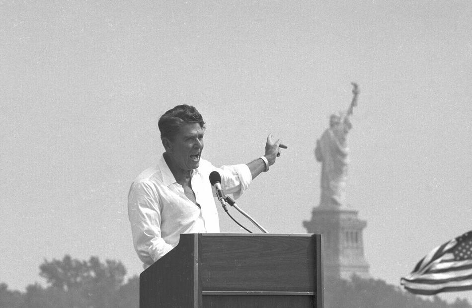 40. Кандидат в президенты от республиканцев Рональд Рейган указывает на статую Свободы за своей спиной во время выступления в парке Джерси-Сити, Нью-Джерси, 1 сентября 1980 года.