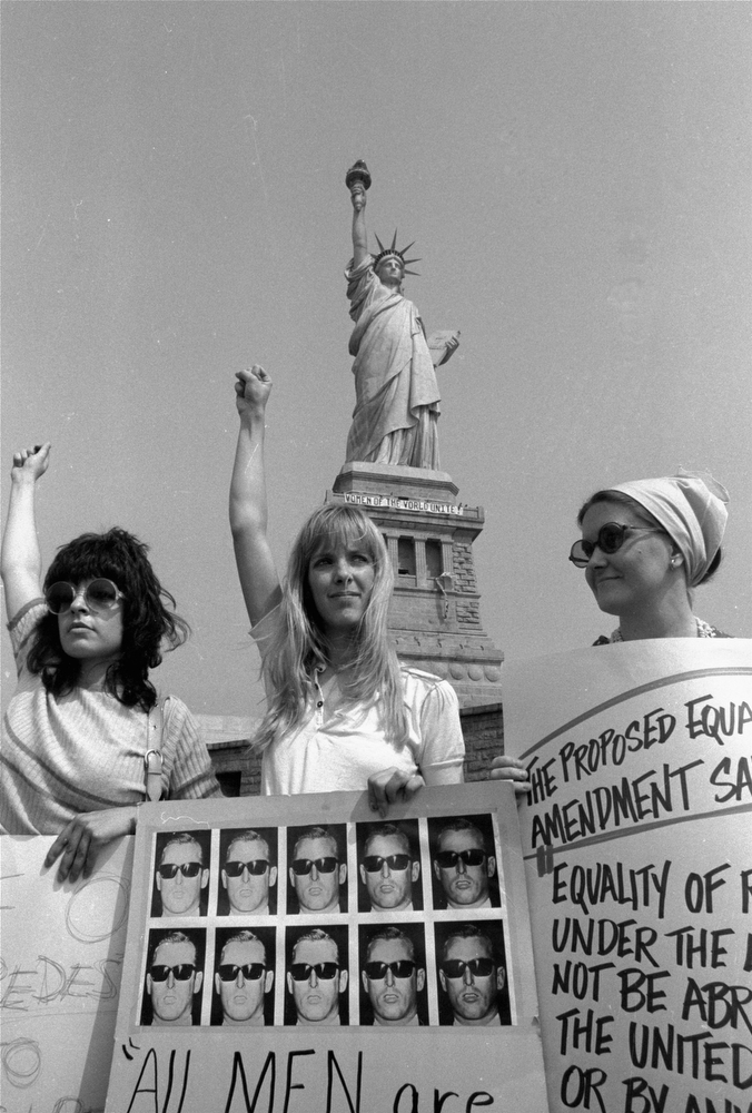 31. Женская демонстрация на острове Свободы, 10 августа 1970 года. Различные группы защиты прав женщин выступили в поддержку поправки о равенстве прав мужчин и женщин, предложенной Конгрессу. В этот же день полицейские заставили их снять баннер с постамента статуи.