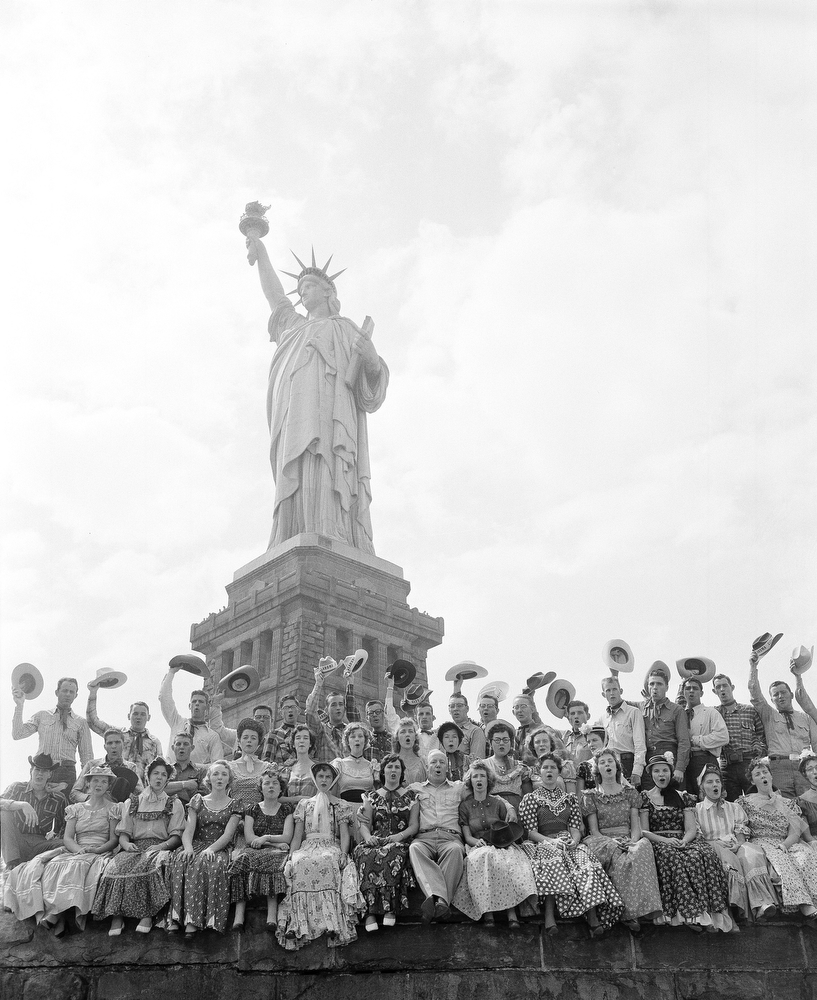 20. Хор Университета Оклахома-Сити в традиционных костюмах поет серенаду девушке с факелом, 16 августа 1955 года. В первом ряду по центру между двумя девушками сидит профессор Джеймс Нильсен, под руководством которого хор приехал выступать на конкурс в Нью-Йорк.