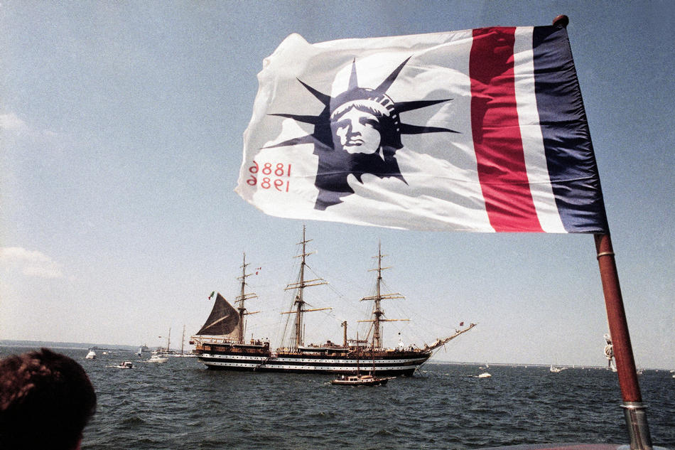 50. Итальянский парусник «Америго Веспуччи» на якоре у полуострова Сэнди-Хук перед подходом к статуе Свободы, 3 июля 1986 года.