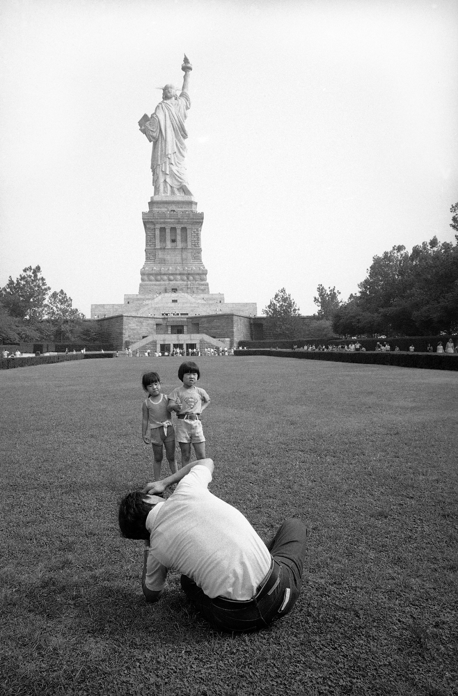39. Отец фотографирует своих детей на фоне статуи Свободы, 3 сентября 1980 года.