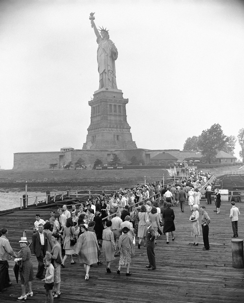 17. Туристы в очереди из США и множества стран стремятся попасть к статуе Свободы, 4 августа 1946 года. Чтобы уберечь статую высотой 34 метра от ветров в бухте, понадобился 47-метровый постамент.