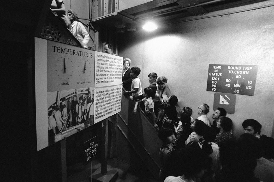 35. Посетители начинают подъем по лестнице к вершине статуи Свободы, 8 сентября 1976 года. Надписи слева предупреждают, что наверху очень тесно, жарче, чем на улице, и вид на бухту Нью-Йорка ограничен из-за малых размеров окон.