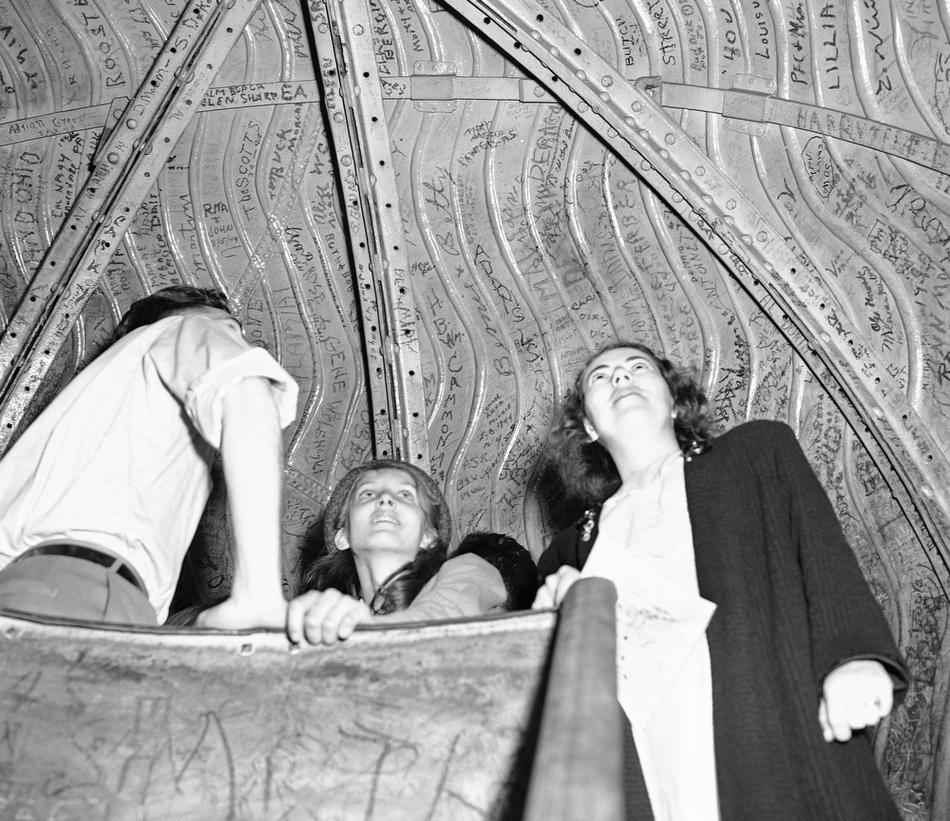 15. Туристы изучают надписи на внутренней части короны статуи Свободы, 4 августа 1946 года. Многие посетители оставляют подписи, чтобы увековечить свой визит в Нью-Йорк.
