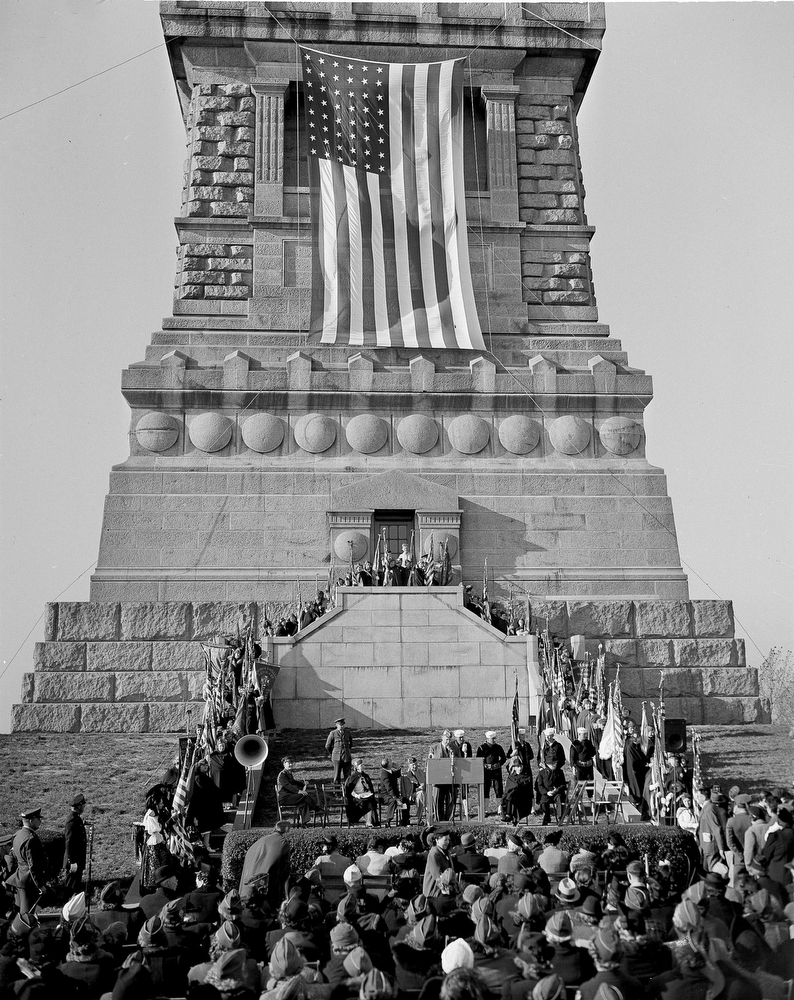 12. Президент Франклин Рузвельт выступает на праздновании 50-й годовщины установки статуи Свободы в Нью-Йорке, 28 октября 1936 года. Он заявил, что «к слову свободы, которое Америка несет всей земле, должно добавиться и слово мира».
