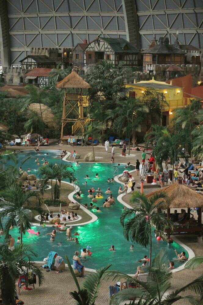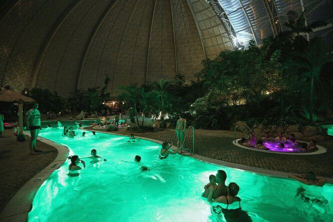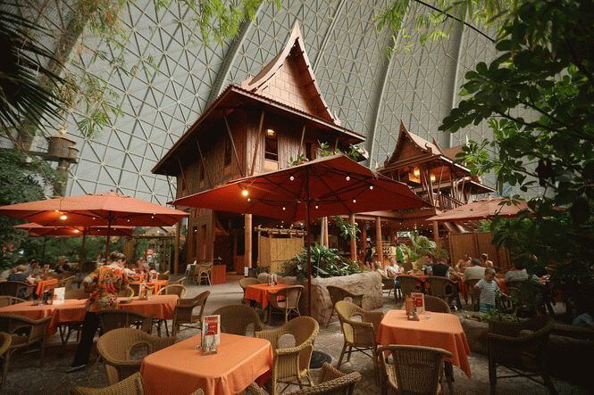 На деньги азиатских спонсоров в бывшем ангаре построили уникальный парк отдыха с собственным микроклиматом. Бассейны оборудовали в стиле естественных водоемов, а вокруг них высадили тропическую растительность.