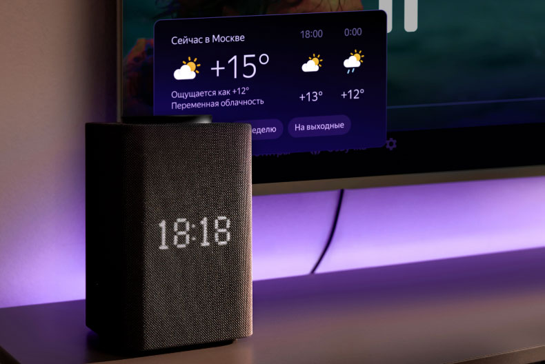 - Интерактивность: круговая подсветка у основания красиво синхронизируется с реакциями Алисы, а на фронтальном экране отображаются часы, забавные моргающие «глазки» помощницы, визуализации музыки или погода.