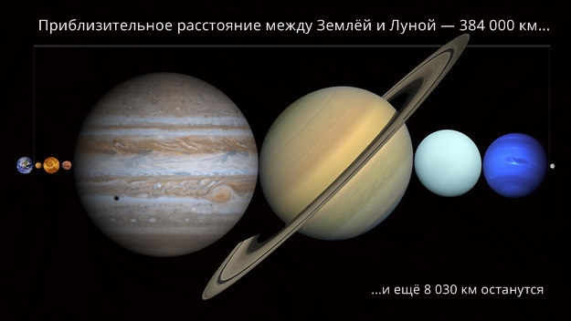 Расстояние между Землёй и Луной (в масштабе). Не так уж и далеко, правда?