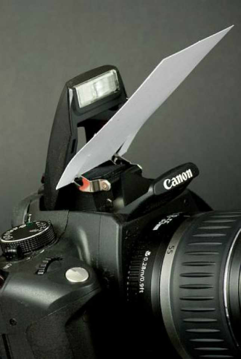 Чтобы снимки, сделанные в вечернее время суток или в помещениях с плохим освещением, не выглядели засвеченными, попробуйте воспользоваться самодельным отражателем для встроенной вспышки. Сделать его можно из плотного листа белой бумаги или пластика.