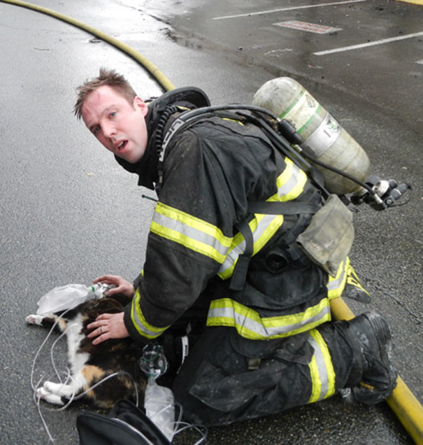 17. Капитан пожарной охраны Джон Лии осматривает одного из двух котов, спасенных из пожара в дуплексе