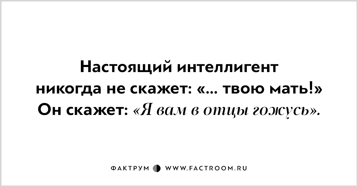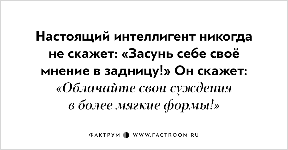 По сути настоящий интеллигент — это английский джентельмен, но нашего замеса! И хоть ему и близко крепкое народное словцо, выпустить его из себя интеллигент не торопится. Он тонок, он использует метафоры и эвфемизмы, но ведь… всё равно же всё понятно, правда?
