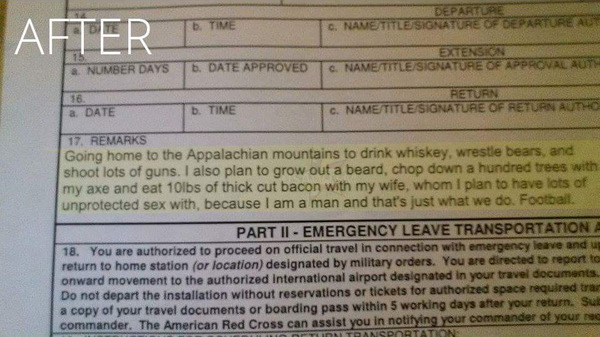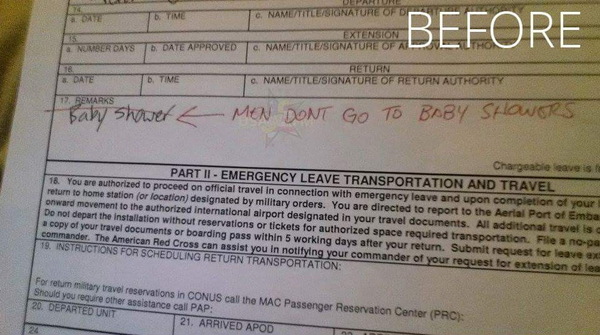 Армейскому спецу отказали в краткосрочном отпуске, когда причиной он указал «Baby shower» — дословно «Детский душ», но на сленге в Штатах так называют вечеринку для будущей матери, где приглашенные «осыпают ее подарками как из душа». В резолюции командир части написал «Детский душ не для мужчин».