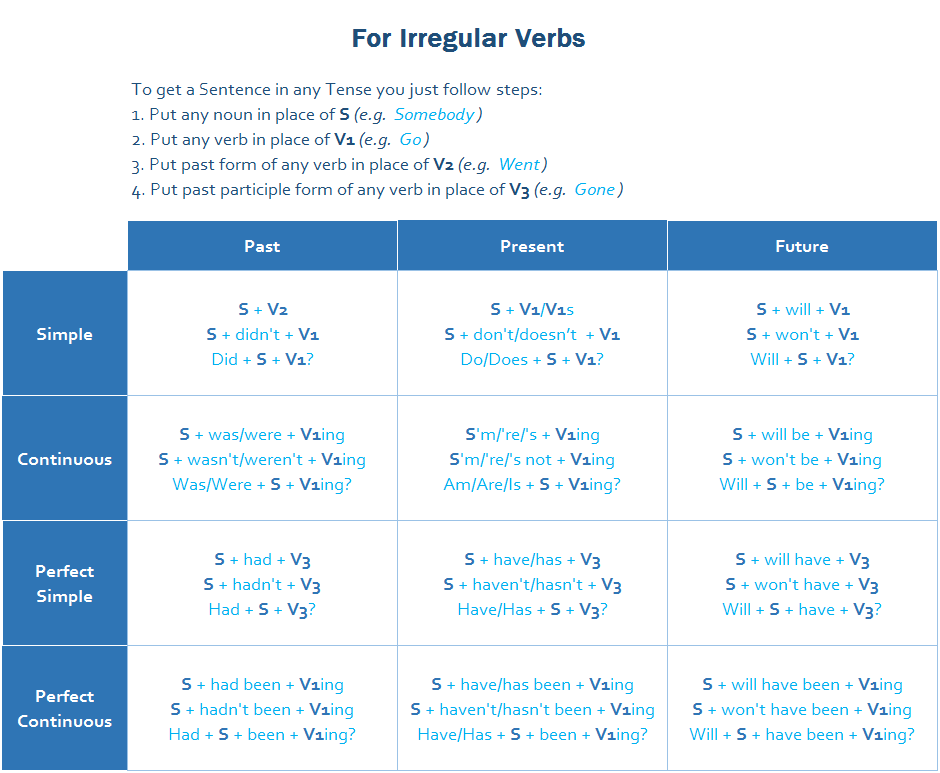 Представляю вам свою новую находку — схему-шпаргалку по всем временам английского языка. С ее помощью вы можете легко построить любое предложение в любом времени, просто возьмите существительное в качестве подлежащего (Subject) и поместите его на место S, возьмите глагол (Verb), который хотите использовать в качестве сказуемого, и поместите его на место V. Готово!