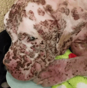 После обследования выяснилось, что Стингер страдает также от чесотки и сильного истощения. Но самым страшным диагнозом для него стала пузырчатка — аутоиммунное заболевание, плохо поддающееся лечению