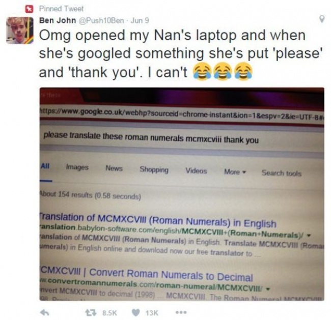 Внук посчитал это настолько трогательным, что разместил фотографию экрана в твиттере с комментарием: «Боже мой! Открыл ноутбук моей бабули и увидел, что когда она что-то гуглит, то помещает запрос между словами „пожалуйста“ и „спасибо“. Ой, я не могу!»