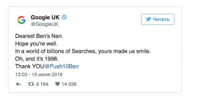 «Дорогая бабушка Бена! Надеемся, вы в порядке. В мире миллиарды запросов, но ваш заставил нас улыбнуться. И, да, кстати, эти римские цифры означают 1998. Спасибо ВАМ».