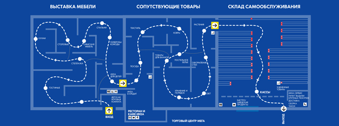 На самом деле, почти любой магазин или стенд этой компании напоминает лабиринт, который спроектирован так, чтобы покупатель увидел по дороге все возможные товары. Среди сотрудников эта планировка называется «Длинный естественный путь».