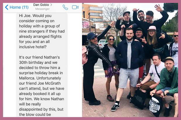 Конечно же, его приятели расстроились, но потом решили, что будет плохо, если деньги, потраченные на билеты и оплату проживания, пропадут просто так. Они нашли на Facebook полного тёзку своего друга и предложили ему поехать отдохнуть на Майорку вместе с ними абсолютно бесплатно.
