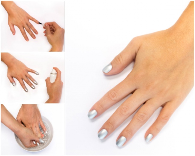 Наносите базу, затем спрей, для закрепления эффекта снова наносите прозрачную основу. Смываете мыльной водой краску с кожи — идеальный маникюр готов!