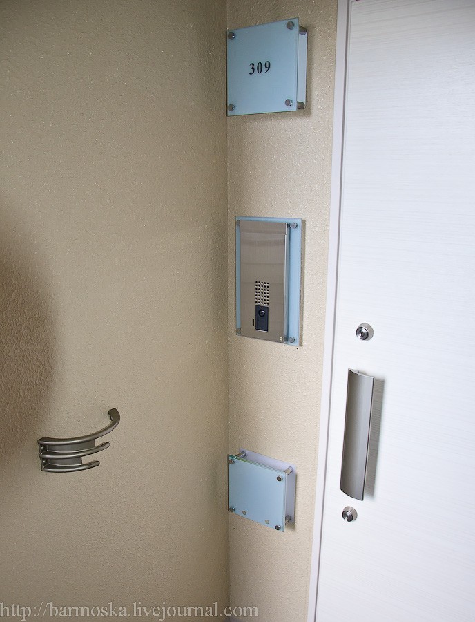 15. Так выглядит вход в квартиру — светильник с номером, внизу лампа для подсветки пола в темное время суток, домофон. Слева специальная ручка, чтобы повесить зонт или сумку, пока открываешь дверь. Сама дверь сделана из металла, правда, не такого тяжелого и прочного, как у нас в России.