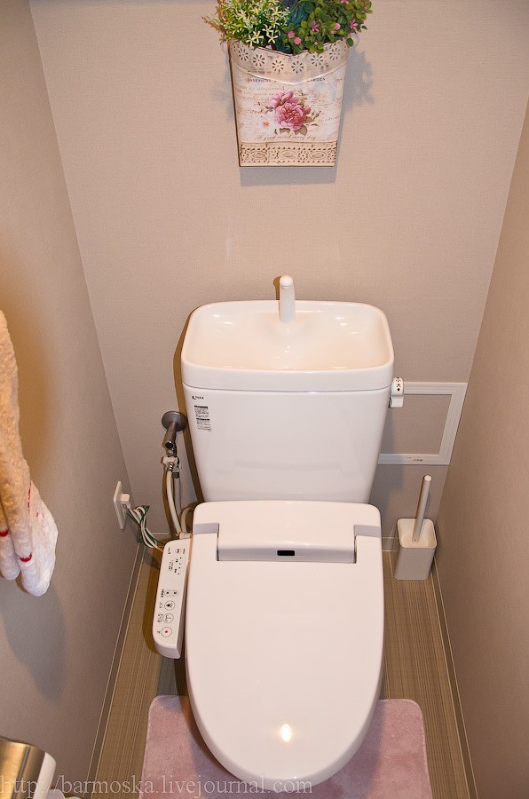 19. Теперь заглядываем в ту дверь, которая была прямо по курсу. Здесь, как видно, находится туалет. Ни разу нигде в Японии (кроме гостиниц) я не видел объединенных ванных комнат с туалетами. Всегда все раздельно, и бывает, что даже и не по соседству. Еще один момент — по умолчанию во всех новых домах устанавливаются туалеты с управлением — пульт с кнопочками слева.