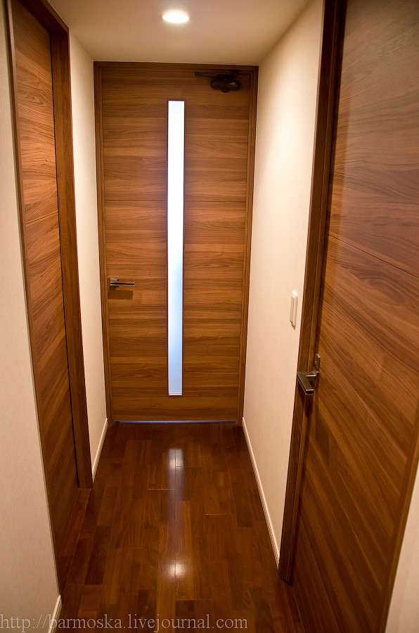 16. Вот наконец-то добрались до самой квартиры. Я попробую объяснить планировку, как получится. Справа виднеется белый порожек, где все оставляют обувь, — это вход. Я стою в коридоре, ведущем в остальную квартиру. В прихожей еще прямо по курсу имеется шкаф.