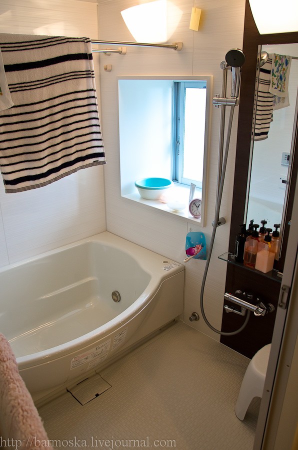 27. А это уже ванная. С окошком, красота. Обратите внимание на душевую лейку и пол — в Японии обычно душ принимают не в самой ванной, а стоя (или сидя) здесь, на этом шершавом пластике. Сток для воды, конечно же, предусмотрен (небольшой лючок под ванной). В зеркале видно отражение еще двух пультов управления — один для ванной, второй для остальных функций (сауна и проч.).