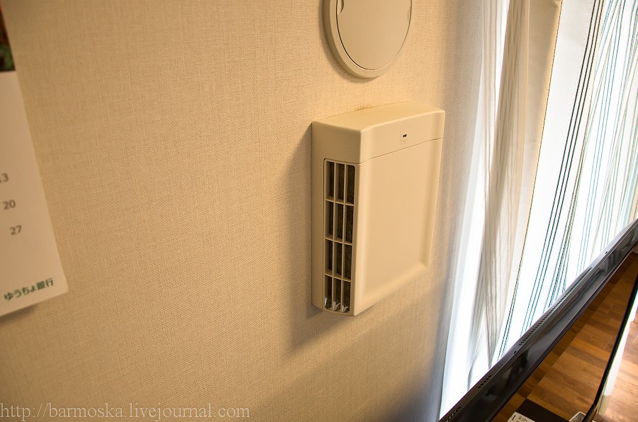 35. На стене позади телевизора люки приточной и принудительной вентиляции. Воздух в квартире очень чистый, кстати.