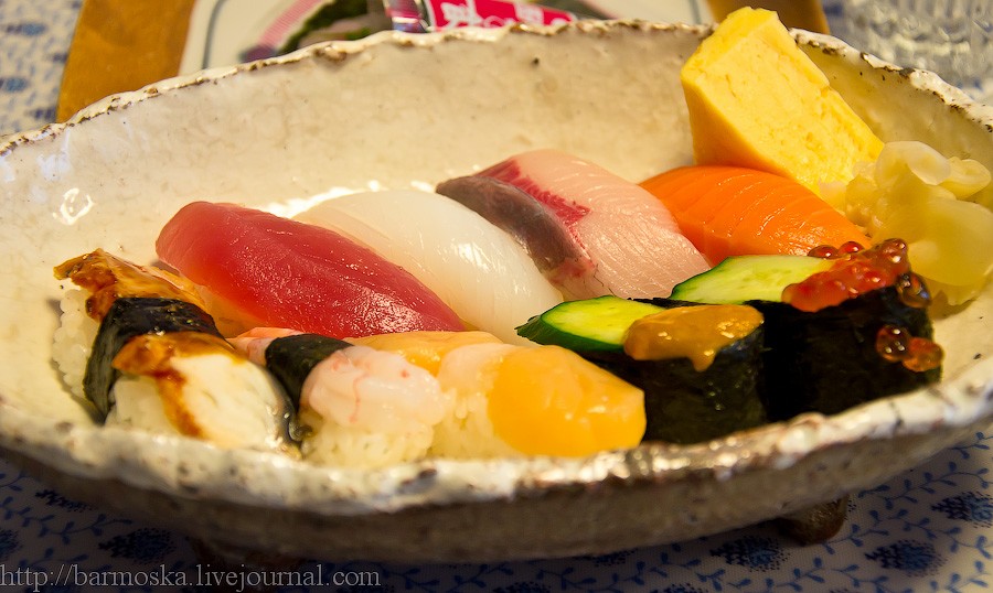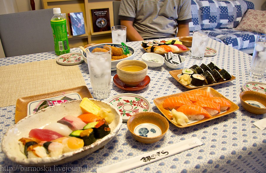 40. Подоспело время обеда. Хозяева угощали чем Бог послал… В этот день он им послал большой ассортимент суши, холодную воду со льдом и немного роллов.