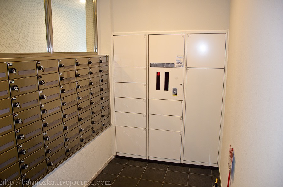 7. А эти белые ящики — своеобразные сейфы для хранения недоставленных бандеролей и посылок. Они устанавливаются во всех новых домах. Как работает эта система? Например, я жилец квартиры номер 601, и мне должна прийти посылка с курьерской службой Black Cat. Я вышел из дома в магазин, и в этот момент приехал курьер. Он позвонил в домофон пару раз, понял, что меня нет, и с внешней стороны дома может положить посылку в одно из свободных отделений этого сейфа. Когда он кладет посылку в ящик, то набирает номер моей квартиры, 601, а затем пишет мне извещение: «Так, мол, и так, приехал и вас не застал дома, посылку положил в ящик номер 1». Я возвращаюсь домой, читаю извещение, подхожу к этому аппарату, прилагаю свой компьютерный ключ от подъезда — компьютер видит, что ключ от квартиры номер 601, и открывает мне ящик, в котором лежит предназначенная для квартиры 601 посылка.
