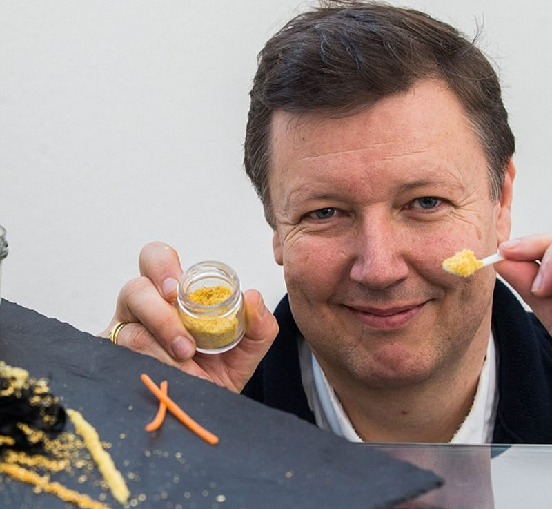 «Это одна из причин, почему она так хороша на вкус. Также важен особый режим сушки перед процедурой полного обезвоживания, в ходе которого икра теряет примерно 80 процентов своего веса. А затем её тщательно перетирают, и смешивают с 22-каратным золотом, которое в небольших количествах оказывает положительное действие на иммунную систему человека. Золотисто-жёлтый порошок, который мы производим, можно легко превратить в пасту, добавлять в ризотто, либо им просто можно посыпать поджаренный хлеб с маслом. У икры ярко выраженный вкус свежей рыбы. Чтобы придать аромат пище, её требуется очень немного», — поясняет он.