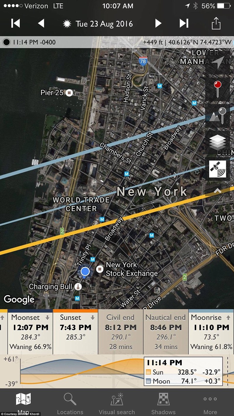Скриншот программы The Photographer’s Ephemeris, с помощью которой удалось вычислить точное положение луны и момент, когда она появится точно позади небоскреба