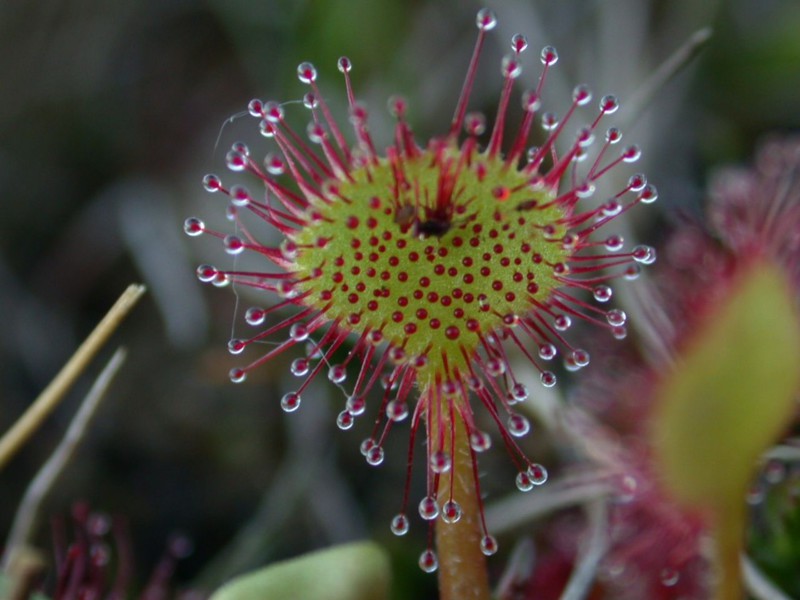 Плотоядное растение, встречающееся на всех континентах, кроме Антарктиды. Росянка выделяет небольшие капельки слизи, с помощью которых ловит насекомых и поедает их.