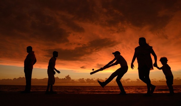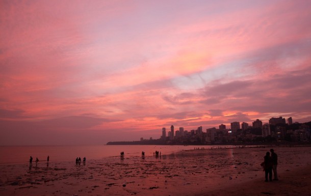 Люди наблюдают за закатом на берегу Аравийского моря, Мумбаи