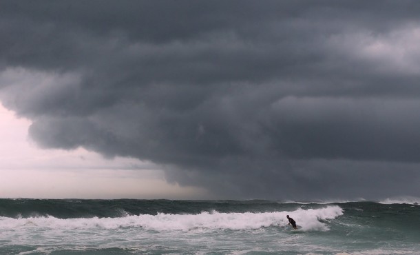 Серфингист катается на волнах во время шторма около Куиджи-Бич, Сидней