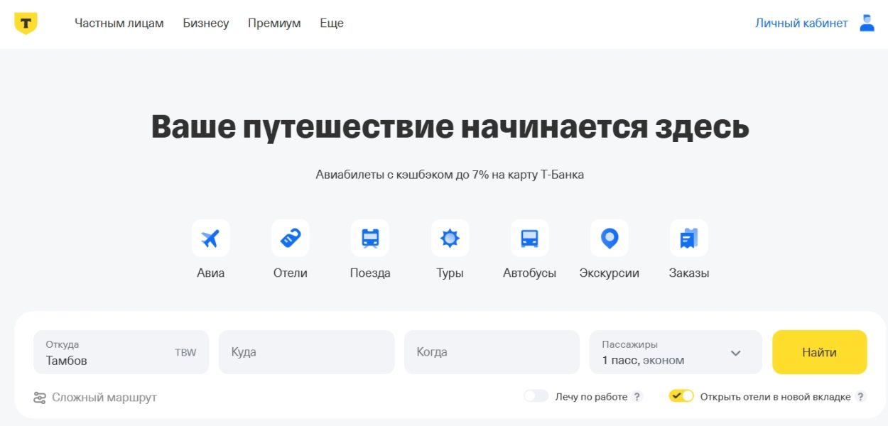 Сервис Т‑Путешествия, запущенный Т‑Банком, предлагает удобное решение для самостоятельных путешественников, которые хотят все: от билетов до отелей в одном месте. Платформа позволяет бронировать авиа- и ж/д билеты, отели, туры и экскурсии, а также отслеживать выгодные предложения через специального бота. Особенно ценится возможность получения кешбэка: до 7% за авиабилеты и до 100% за отели — сумма формируется индивидуально и зависит от типа карты и подписки.