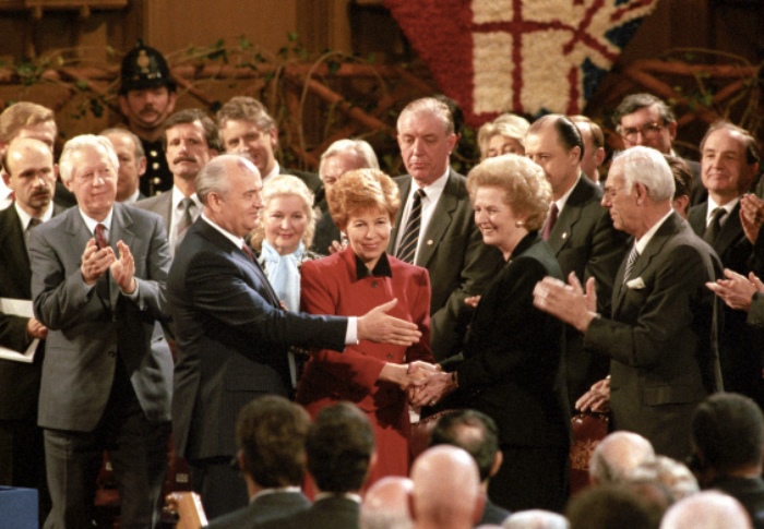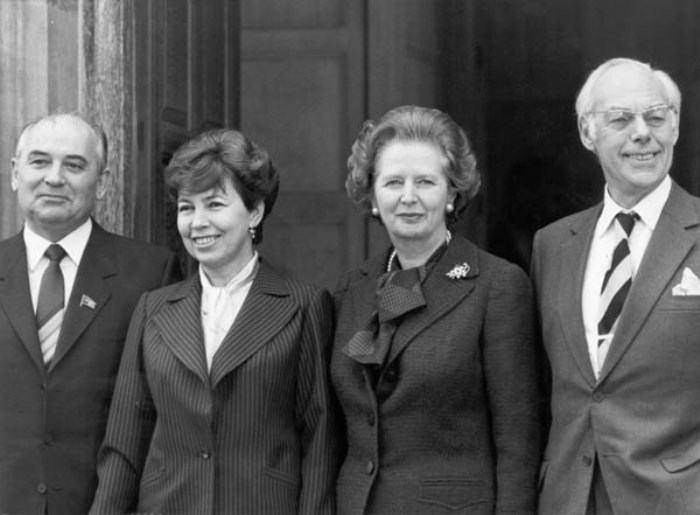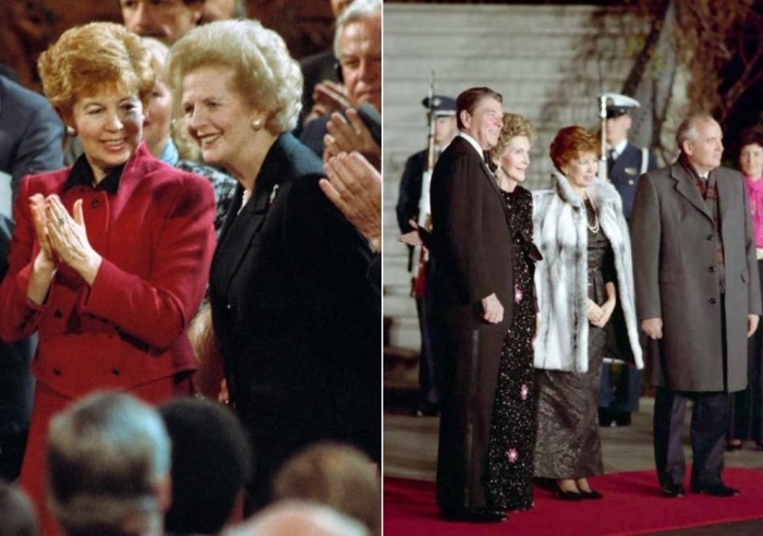 Слева – Раиса Горбачева и Маргарет Тэтчер, 1989. Справа – Чета Горбачевых во время визита в США, 1987