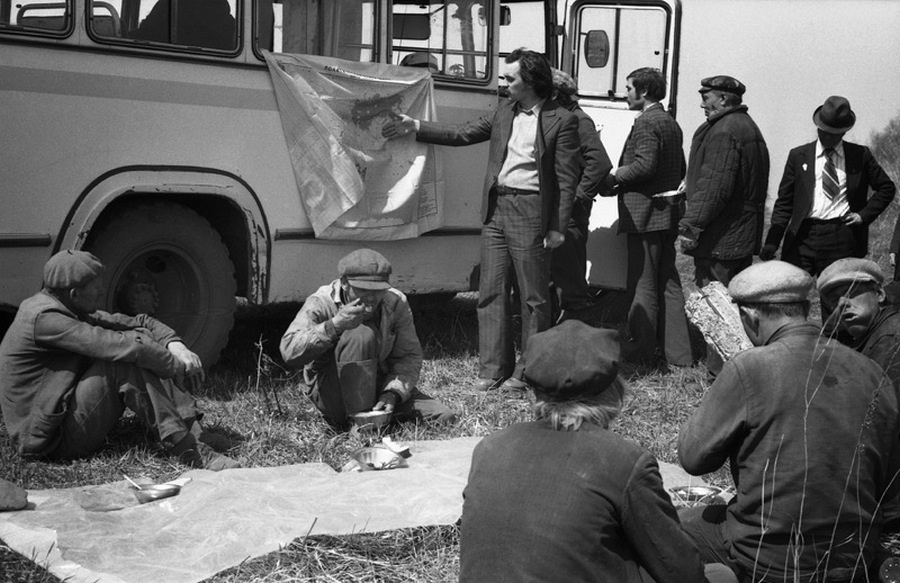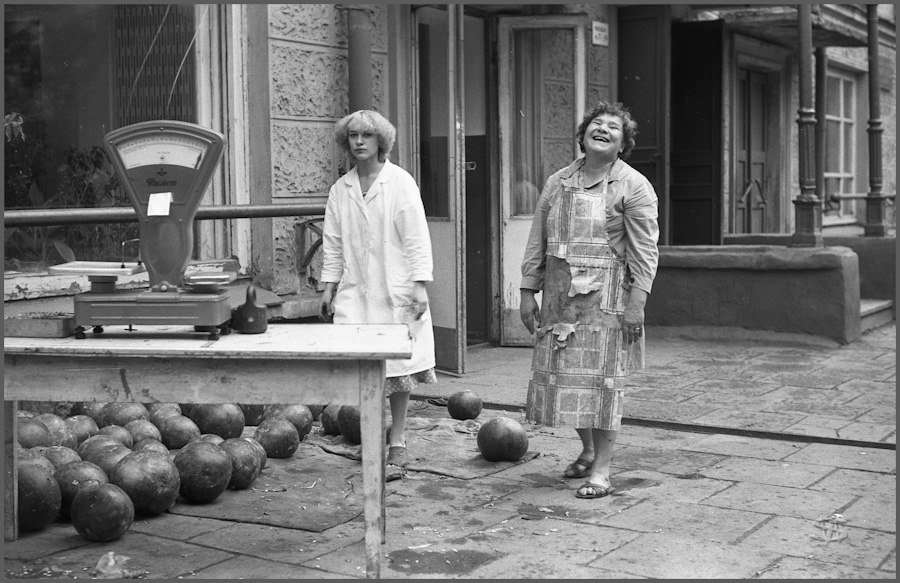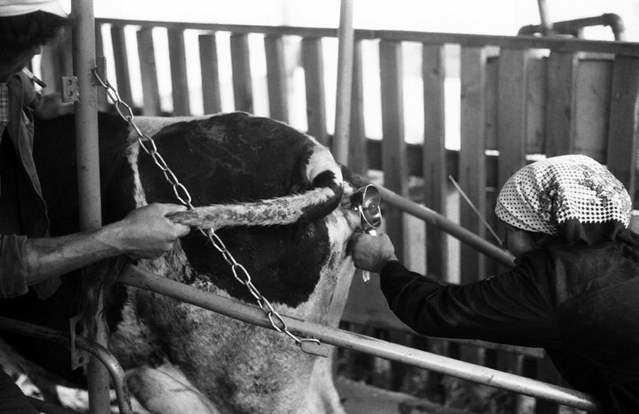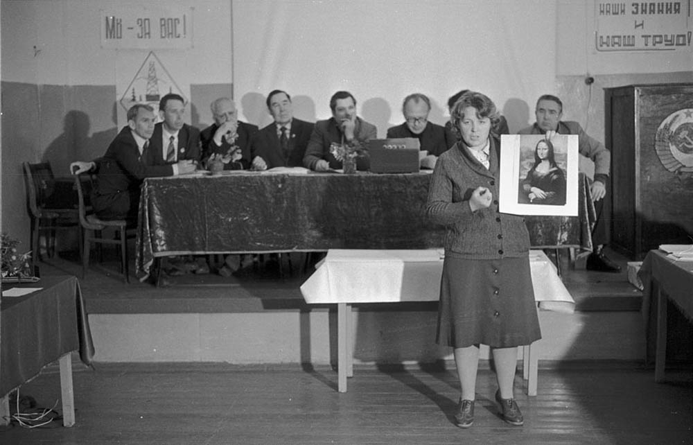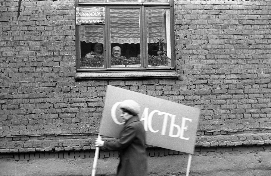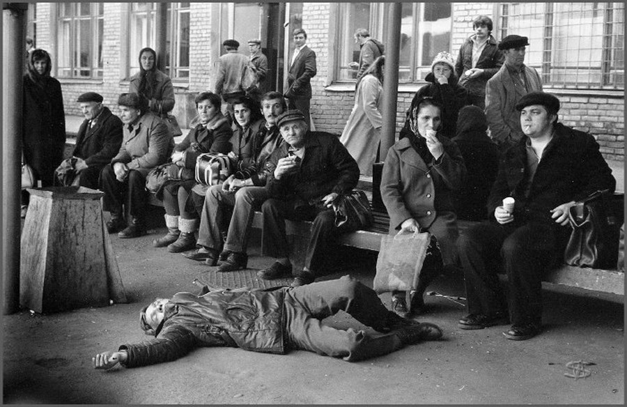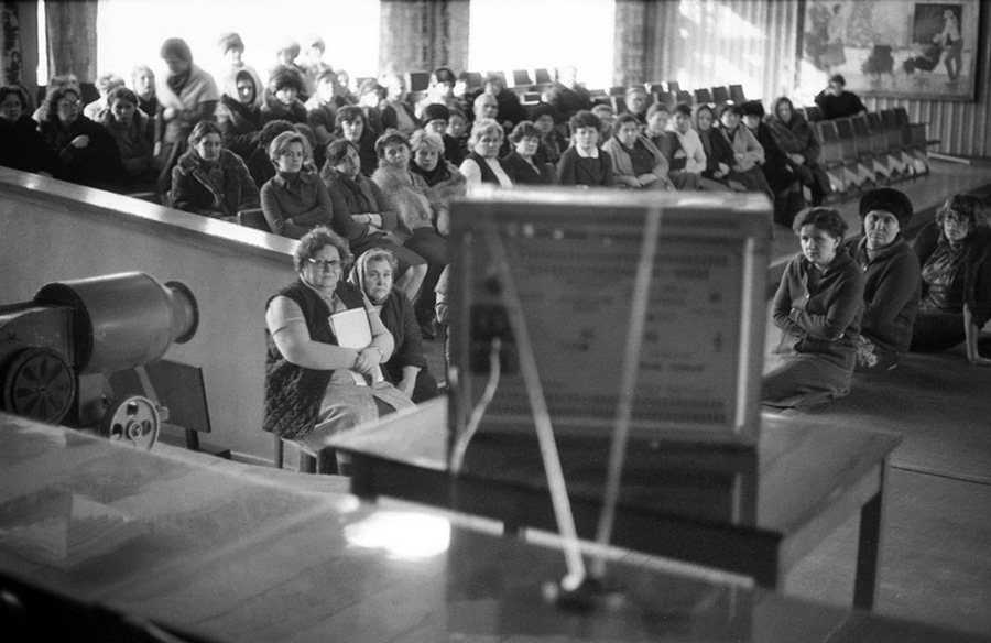 Перед торжественным чаепитием в честь памятного дня начальника финансового отдела юбиляр благодарит коллектив. Новокузнецк. Кемеровская область. Кузбасс. Сибирь.Прямая трансляция похорон Генерального секретаря ЦК КПСС Ю.В.Андропова. Дом Быта. Проспект Бардина. Новокузнецк. Кемеровская область. Кузбасс. Сибирь. 14.02.1984.На традиционное массовое гуляние в честь праздника Масленицы «горпромторг» порадовал жителей района не только блинами, а и обилием дешевых крепленых вин. Кузнецкий район. Новокузнецк. Кемеровская область. Кузбасс. Сибирь. 13.03.1983.Возвращение с первомайской демонстрации — торжественного прохождения колонн трудящихся перед руководителями района, стоящими на трибуне. Праздник Международной солидарности трудящихся всех стран. В руках бывших демонстрантов свернутые флаги, портреты руководителей государства и тяжелый стенд с названием завода. Площадь Ленина. Кузнецкий район. Новокузнецк. Кемеровская область. Кузбасс. Сибирь. 1.05.1983.«Красная борозда» — последнее поле, которое убирается всеми комбайнами бригады. После «красной борозды» руководство совхоза «накрывает поляну» — выставляет угощение. Совхоз «Белогородский». Мариинский район. Кемеровская область. Сибирь. РоссияИскусственное осеменение вместо ветеринара проводит, с помощью пастуха старшая доярка. 3-я дойка совхоза «Еланский». Новокузнецкий район. Кемеровская область. Кузбасс. Сибирь. 8.07.1983Осенние дыни на проспекте Энтузиастов. 18.09.1981.Лекция о международном положении читается механизаторам во время обеда, привезенного в поле на автобусе вместе с лектором из общества «Знание». Считается, что такое знание увеличивает активность крестьян. Посевная. Совхоз “Еланский”. Новокузнецкий район. Кемеровская область. Кузбасс. Сибирь.Пьяный работник шахты в субботнее утро перед Днем Шахтера. Двор на проспекте Металлургов. Новокузнецк. Кемеровская область. Кузбасс. Сибирь. 27.08.1983Для пополнения запасов крови городская станция переливания крови организует «Дни Донора» на предприятиях города. Мобильная бригада врачей расположилась в медпункте рельсобалочного цеха. У молодых рабочих завода перед сдачей крови делается ее анализ и замеряется давление. После сдачи крови для восстановления сил рабочие получат талоны на бесплатный обед и день к отпуску. Кузнецкий металлургический комбинат. Новокузнецк. Кемеровская область. Сибирь. 16.09.1981.