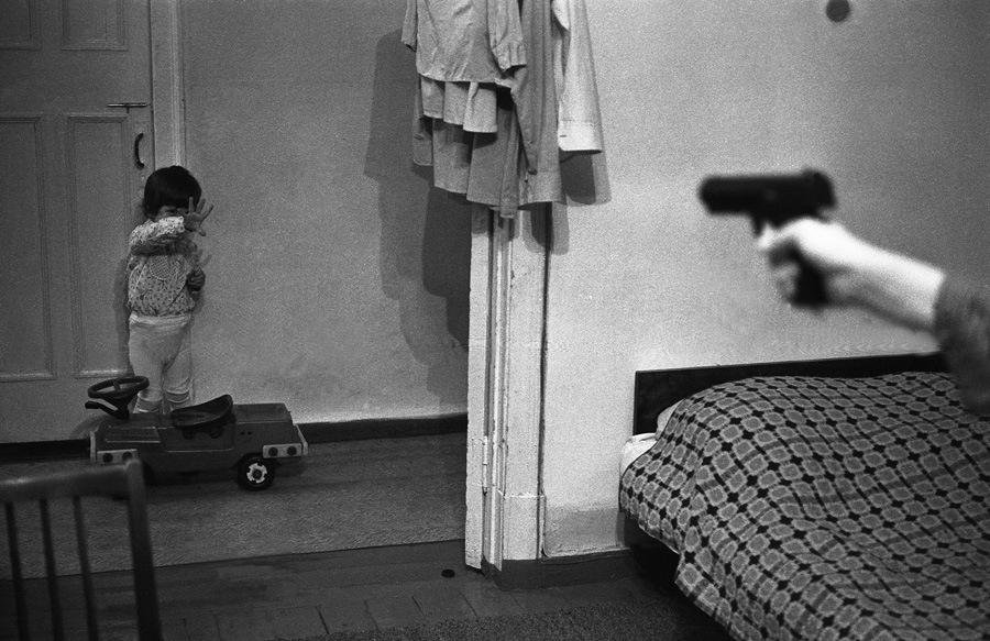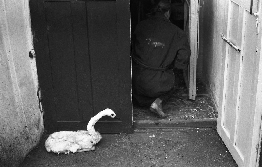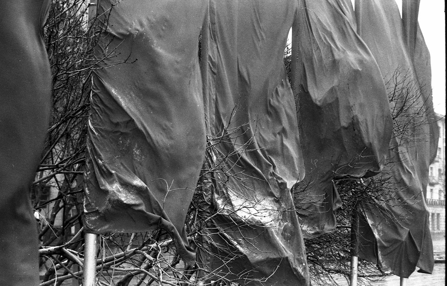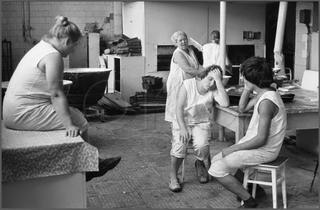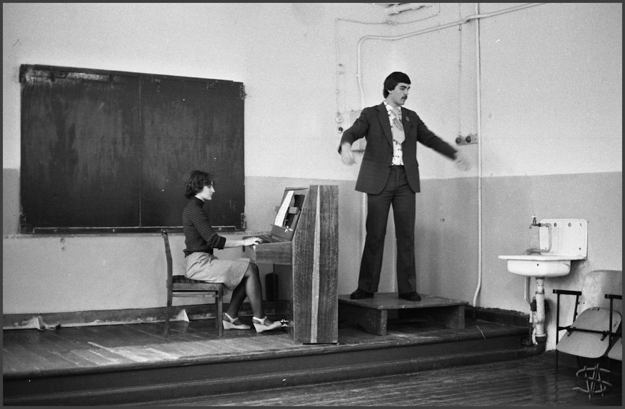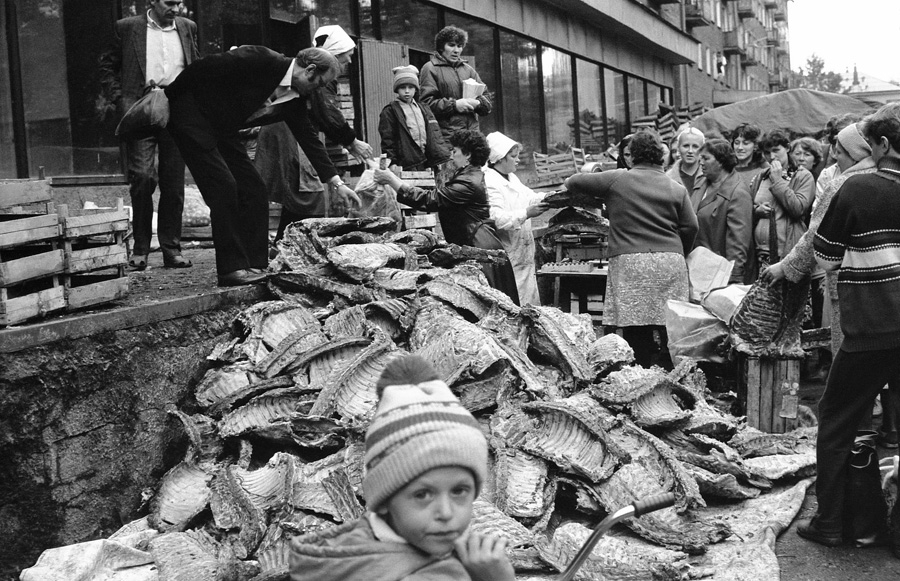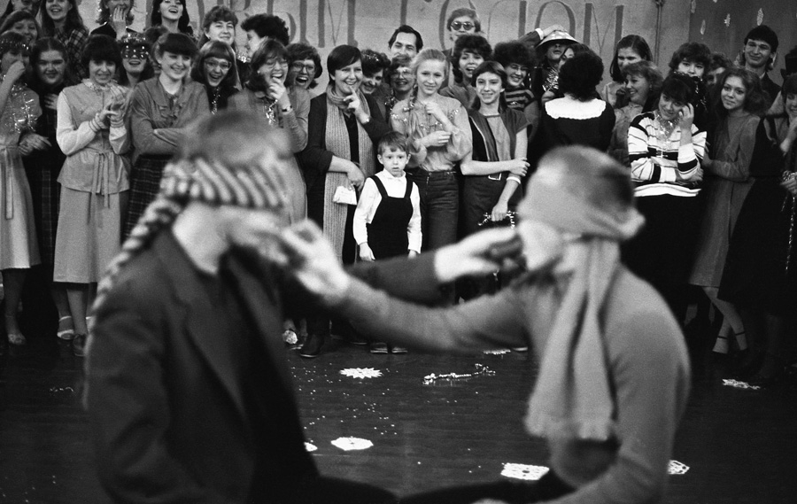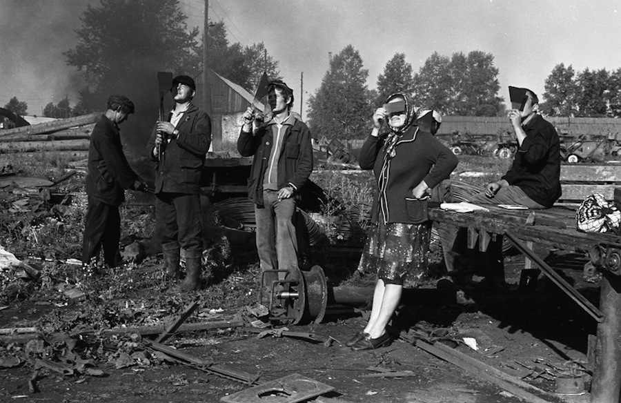 Перед торжественным чаепитием в честь памятного дня начальника финансового отдела юбиляр благодарит коллектив. Новокузнецк. Кемеровская область. Кузбасс. Сибирь.Прямая трансляция похорон Генерального секретаря ЦК КПСС Ю.В.Андропова. Дом Быта. Проспект Бардина. Новокузнецк. Кемеровская область. Кузбасс. Сибирь. 14.02.1984.На традиционное массовое гуляние в честь праздника Масленицы «горпромторг» порадовал жителей района не только блинами, а и обилием дешевых крепленых вин. Кузнецкий район. Новокузнецк. Кемеровская область. Кузбасс. Сибирь. 13.03.1983.Возвращение с первомайской демонстрации — торжественного прохождения колонн трудящихся перед руководителями района, стоящими на трибуне. Праздник Международной солидарности трудящихся всех стран. В руках бывших демонстрантов свернутые флаги, портреты руководителей государства и тяжелый стенд с названием завода. Площадь Ленина. Кузнецкий район. Новокузнецк. Кемеровская область. Кузбасс. Сибирь. 1.05.1983.«Красная борозда» — последнее поле, которое убирается всеми комбайнами бригады. После «красной борозды» руководство совхоза «накрывает поляну» — выставляет угощение. Совхоз «Белогородский». Мариинский район. Кемеровская область. Сибирь. РоссияИскусственное осеменение вместо ветеринара проводит, с помощью пастуха старшая доярка. 3-я дойка совхоза «Еланский». Новокузнецкий район. Кемеровская область. Кузбасс. Сибирь. 8.07.1983Осенние дыни на проспекте Энтузиастов. 18.09.1981.Лекция о международном положении читается механизаторам во время обеда, привезенного в поле на автобусе вместе с лектором из общества «Знание». Считается, что такое знание увеличивает активность крестьян. Посевная. Совхоз “Еланский”. Новокузнецкий район. Кемеровская область. Кузбасс. Сибирь.Пьяный работник шахты в субботнее утро перед Днем Шахтера. Двор на проспекте Металлургов. Новокузнецк. Кемеровская область. Кузбасс. Сибирь. 27.08.1983Для пополнения запасов крови городская станция переливания крови организует «Дни Донора» на предприятиях города. Мобильная бригада врачей расположилась в медпункте рельсобалочного цеха. У молодых рабочих завода перед сдачей крови делается ее анализ и замеряется давление. После сдачи крови для восстановления сил рабочие получат талоны на бесплатный обед и день к отпуску. Кузнецкий металлургический комбинат. Новокузнецк. Кемеровская область. Сибирь. 16.09.1981.