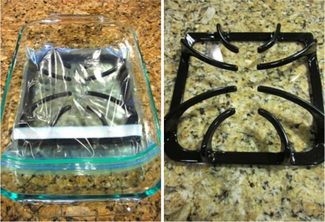 Убрать жир на решетке можно с помощью нашатырного спирта. Положите решетку в пластиковый мешок и добавьте туда 2―3 ст. л. нашатырного спирта. Через 12 часов промойте ее.