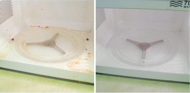Налейте 1 стакан воды в большую емкость и добавьте несколько столовых ложек уксуса. Затем включите микроволновку и дождитесь, пока окошко в дверце запотеет. Выключите и дайте остыть в течение 15 минут, прежде чем открывать дверцу, затем уберите посуду и протрите влажной губкой.