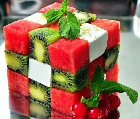 Попробуйте соорудить съедобный кубик Рубика. Разбирать его очень просто. Для этого не нужно прилагать никаких усилий. Вам потребуется лишь вилка или ложка. Советуем добавить к арубузу киви и фету. Получится и вкусно, и аппетитно.