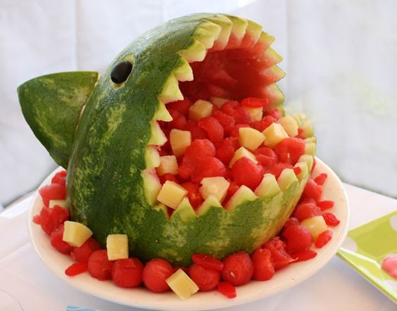 По мотивам фильма «Челюсти». Только в нашем случае акула вполне безобидная и никого кусать не собирается. Так что можно без опаски доставать из ее пасти арбузные дольки. Эта идея прекрасно впишется в тематическую вечеринку.
