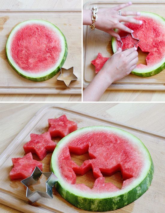 Из арбуза получается прекрасное канапе. Нарежьте ягоду на небольшие кубики и вместе с другими ингредиентами наколите на деревянные шпажки. А можно и вовсе воспользоваться формочками для печенья в форме звезд или сердечек. Получится очень эффектно и по-праздничному!