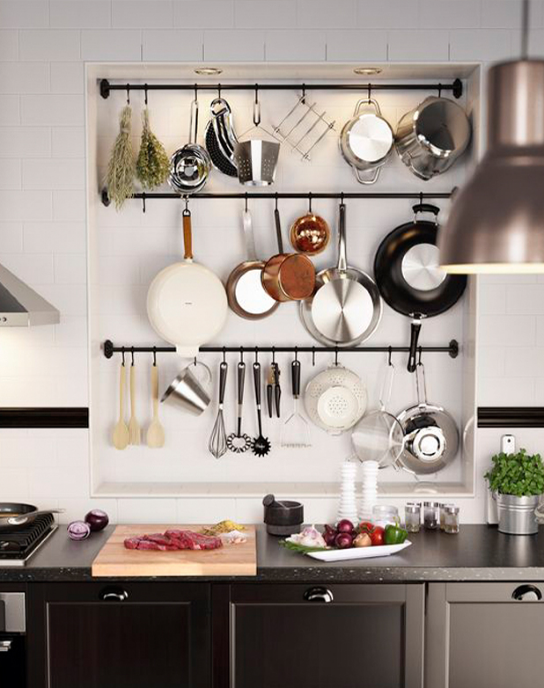 19. Можно и место сэкономить, и превратить свою кухоньку в кухню шеф-повара, развесив несколько сковород и кастрюль или других аксессуаров прямо на стене.
