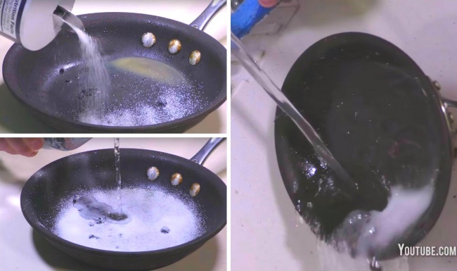 Избавиться от прилипших кусочков и застывшего жира поможет обычная соль. Густо покройте дно сковороды солью, добавьте немного воды. Оставьте на 10 минут.