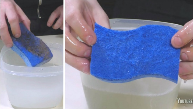 Налейте в пластиковый контейнер 2 стакана горячей воды и 2 ст. л. соли, размешайте, положите в него губку и оставьте на ночь.